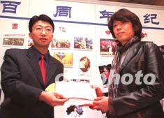 十二月三日晚,拯救白血病患的“陽光計劃1000”義演晚會在北京大學(xué)百年紀(jì)念堂拉開序幕,校園歌手老狼出任陽光大使,并進(jìn)行沉寂七年后推出的專輯<晴朗>的簽售。圖為老狼從北京大學(xué)身患白血病的學(xué)生劉正琛手中接過證書。作者:廖文靜