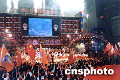 當上海以絕對優勢獲得二○一○年世界博覽會主辦權的消息傳來,上海南京路世紀廣場頓時成了歡樂的海洋。四面八方聚集而來的上海市民,揮舞著手中印有世博會徽標的各色旗幟和國旗,盡情地歡呼。姜煜 攝