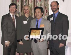 中國基因研究專家楊煥明(左三)及其研究小組今年四月在《科學》雜志發表《水稻基因組工作框架圖》,在世界上首次將完整的水稻基因組草圖序列向公共數據庫公開。楊煥明因此被《科學美國人》被評為年度科研領袖人物,十日在紐約接受頒獎。作者:趙海燕