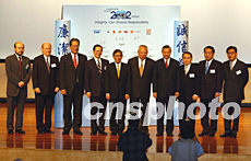 董建華與香港商政領袖簽署誠信協議。二零零二年領導論壇“商政領袖面對的誠信挑戰”十二月十二日在香港舉行,香港特區行政長官董建華(右五)、公務員事務局局長王永平(左五)及廉政專員李少光(右四)等在該論壇上簽署誠信協議。潘索菲 攝