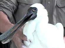 臺南縣家畜疾病防治所所長謝耀清說,病態黑面琵鷺臨床癥狀有明顯的軟頸、翅膀下垂、兩腳無力、呼吸困難等肌肉無力癥狀及散瞳現象。