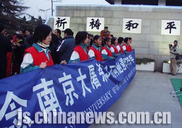 鳴響警報的主會場位于南京江東門侵華日軍南京大屠殺遇難同胞紀念館。江蘇省和南京市黨、政、軍及各界人士三千多人在這里隆重舉行“悼念南京大屠殺三十萬同胞遇難六十五周年儀式暨南京國際和平集會”。隨著低沉的警報聲,人們低首默哀三分鐘,緬懷六十五年前遇難的同胞。
