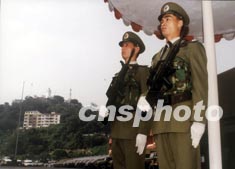 中國人民解放軍駐澳門部隊在古老的松山燈塔下站崗。作者:中新社