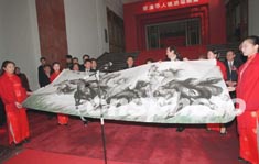 旅澳華人畫(huà)家姚迪雄先生(右),十八日在北京中國(guó)革命博物館開(kāi)幕的個(gè)人畫(huà)展上,向北京奧林匹克博物館敬贈(zèng)《八駿圖》大幅國(guó)畫(huà)。作者:鄒憲