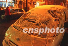 北京城十二月中旬連降瑞雪,頑童雪夜利用路邊轎車上的積雪,大玩涂鴉藝術。作者:賈國榮