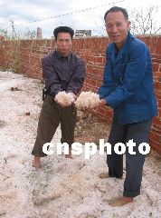 據(jù)了解,遂溪縣的江洪鎮(zhèn)和河頭鎮(zhèn)也同時遭受了這一重災(zāi)。村民說,最大的一塊冰雹50多公斤,直徑達40厘米。受災(zāi)地面堆積冰層約20厘米厚。