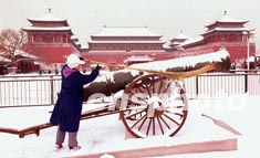 北京連續(xù)六天降雪創(chuàng)下百年紀錄。二十四日,京城終于雪過天晴,一位保潔工人正在故宮午門前清掃神威大炮上的積雪。作者:張煒