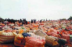 連日來,陸豐、碣石等三級黨委、政府針對陸豐碣石鎮瘋狂走私洋垃圾衫一事,積極組織包括海關、邊防、公安、工商等專項隊伍,出動1000余人次,對陸豐碣石鎮的所有市場、村莊等采取逐家清查的地毯式清理。到昨天為止,共查獲洋垃圾衫達1200捆、近100噸。