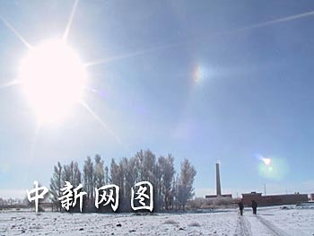 中國酒泉衛星發射中心上空日前出現難得一見的日暈現象——天空同時出現一大兩小三個太陽。中新社記者 孫自法 攝
