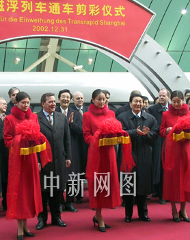 中新網(wǎng)12月31日電 世界第一條磁浮商業(yè)示范線——上海磁浮列車線今天上午試運行通車,國務(wù)院總理朱镕基和正在中國訪問的德國總理施羅德親臨現(xiàn)場,為上海磁浮列車示范運營線試運行通車剪彩,并一同乘坐了首發(fā)的磁浮列車。