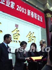 來自世界各地的華人企業家三日在北京釣魚臺舉行新春聯誼會。全國政協副主席孫孚凌(右一)到會為多名貢獻突出的華人頒發“華人企業家證書”。作者:王麗南