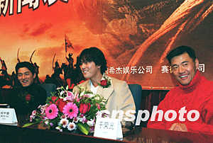 總投資七百萬美元、有韓國版《英雄》之稱的《武士》四日在北京舉行中國首映禮,欲與熱播中的《英雄》一爭高下。圖為片中主角韓國當紅影星朱鎮模、鄭宇盛、與中國影星于榮光(從左至右)與北京媒體見面。作者:武仲林