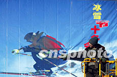 一名工人五日在哈爾濱街頭張掛冰雪運動宣傳畫,為五日晚在這里開幕的國第十屆冬季運動會暨第十九屆哈爾濱國際冰雪節造勢。作者:毛建軍