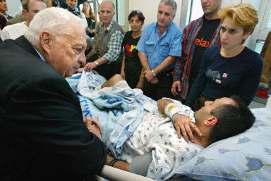 兩名巴勒斯坦人5日傍晚在交通高峰期在特拉維夫市中心區發動自殺炸彈襲擊,造成二十五人死亡,約一百人受傷。圖為以色列總理沙龍到醫院看望受傷人員。