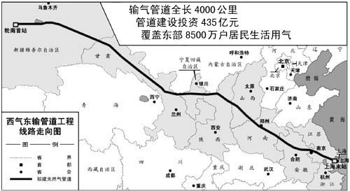 作為中國最長的管道工程和實(shí)施西部大開發(fā)戰(zhàn)略的標(biāo)志性項(xiàng)目,西氣東輸管道工程于2002年7月4日開工。該管線的建成將使中國的天然氣產(chǎn)量增加50%,使天然氣占全國一次能源結(jié)構(gòu)的比重由2.1%提高到3%。