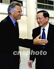 中國外交部部長唐家璇,九日在北京與來訪的法國外長德維爾潘舉行會談。作者:鄭萍萍