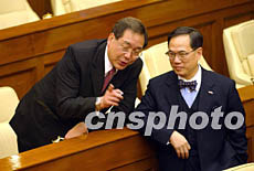 香港政務司長曾蔭權、教育統籌局長李國章,1月9日提早到達立法會,準備出席董建華答問大會。洪少葵 攝