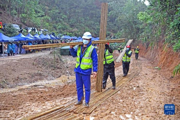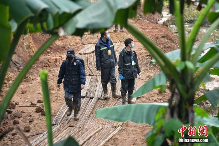 墜機事故現場下雨 工作人員鋪設竹排小道
