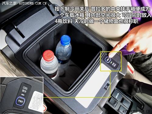 普拉多前排門板的儲物槽很寬很深,而且有單獨的杯架位置。而中間位置的兩個杯架都帶有限位機構,實用性很強。最大的亮點是前排的中央扶手箱,打開制冷開關后,它就成為一個可以容納4瓶飲料的車載冰箱啦。