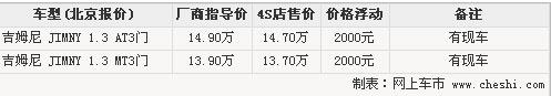 吉姆尼是鈴木引進中國的一款微型SUV,出色的越野能力和時尚可愛的外觀,讓吉姆尼在國內風靡一時。不過由于價格和實際使用價值方面的問題,吉姆尼的銷量很一般。近期,網上車市走訪了北京地區長安鈴木4S店,了解到吉姆尼目前有2000元的現金優惠,具體信息請參考下表: