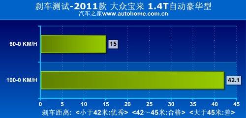 大眾的剎車系統一直保持著不錯的傳統,成績不算特別突出,表現會比較穩定,寶來1.4T的剎車表現也是如此,42.1米的成績不算優異,但也令人滿意。