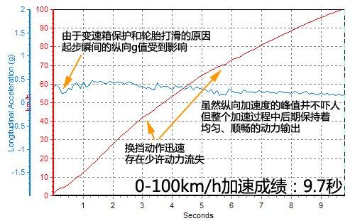 由于雙離合變速箱的自我保護程序以及輪胎打滑的影響,起步瞬間車輛的加速度并不像想象的那么高,好在之后發動機的輸出一直很流暢,全油門狀態下變速箱會把升擋時機延遲到7000轉以后,整個沖刺過程沒有太大的波瀾,9.7秒的成績在緊湊家用車當中已屬上乘,而按排量算起來更是沒有太多競爭對手。
