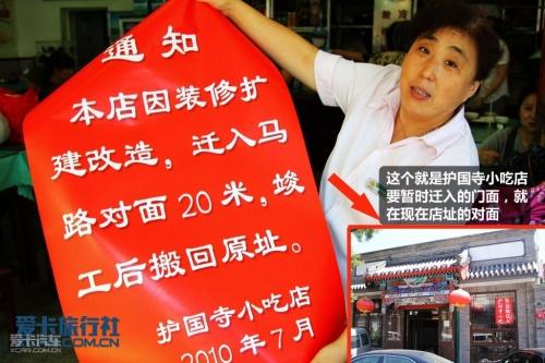 路北是“護國寺小吃店”,店面不大,卻名聲很大。因為它是護國寺廟會特色小吃的傳承者和集大成者。1956年,當廟會停辦時,為不使廟會上的特色小吃失傳,有關部門將在廟會上頗具名氣的茶湯英、扒糕年、白薯王等十多位攤商組織起來,開辦了護國寺小吃店。