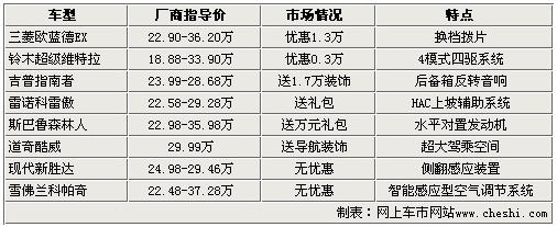 今天我們?yōu)榇蠹規(guī)?lái)了8款SUV車(chē)型,它們的售價(jià)區(qū)間都在20-30萬(wàn)左右,與部分國(guó)產(chǎn)加價(jià)SUV處于同一價(jià)格區(qū)間,姑且不說(shuō)它們的市場(chǎng)有多大,單憑它們都是純進(jìn)口這一項(xiàng)就表露出明顯的優(yōu)勢(shì)。況且,它們還有一個(gè)更為有利的優(yōu)勢(shì),就是不加價(jià)!作為汽車(chē)銷(xiāo)量的直接影響者,我們首先就不能讓加價(jià)這種“潛規(guī)則”有生存的機(jī)會(huì)。
