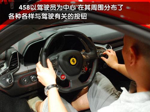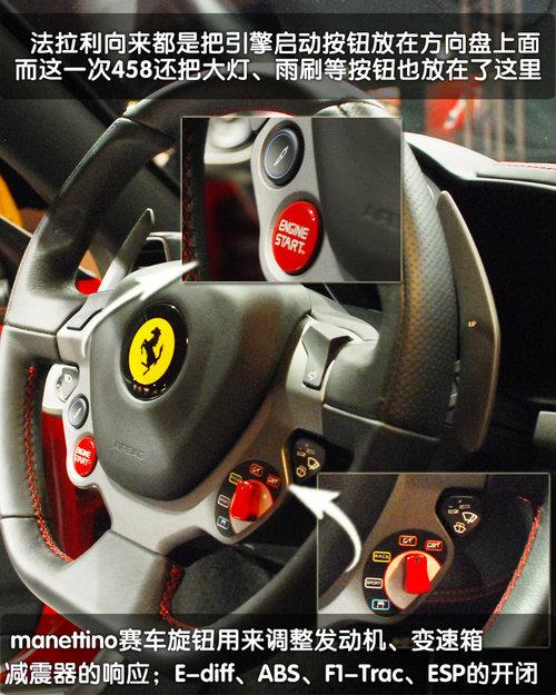 458Italia的內(nèi)飾設(shè)計理念是以駕駛員為核心,所以身處駕駛席的時候你會發(fā)現(xiàn)在你的眼前以及左右手的周圍分布了非常多的儀表、按鈕,這種感覺有點兒像是坐在一臺飛機的駕駛室里面。想要熟悉一下458Italia的這些按鈕真的需要一些時間。