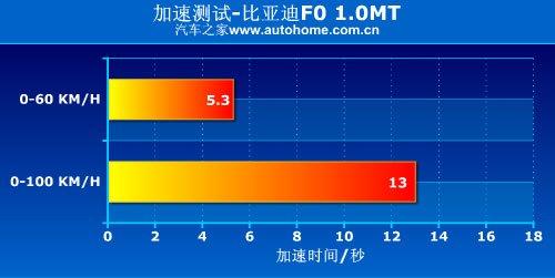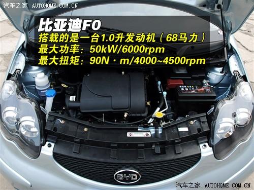 比亞迪F0搭載的是排量為1.0L的3缸全鋁發動機,最大功率為68馬力,最大扭矩90牛米,在國內同級別的車型中,它的動力性是比較出色的,0-100Km/h加速只用了13秒,在微型車中算是比較不錯的成績了,但表現不佳的剎車成績讓人缺乏安全感。關于它詳細的測試,可以參考下面的文章: