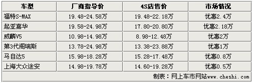 通過上表我們可以看出,六款車型在售價(jià)方面都有不同程度的下浮。其中以嘉華、福特S-MAX和威麟V5為首的大幅度降價(jià)車型,降價(jià)幅度都達(dá)到了2萬(wàn)元以上。第3代閣瑞斯獨(dú)領(lǐng)一萬(wàn)元降價(jià)區(qū)間,馬自達(dá)5和途安這兩款更為熱銷的車型,由于關(guān)注度較高,現(xiàn)車也較為緊張,優(yōu)惠幅度也僅有5千元和8千元的小幅度降價(jià)優(yōu)惠。