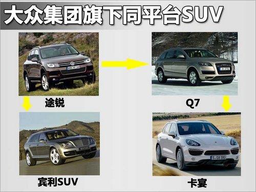 大眾集團旗下擁有多個高端以及豪華品牌,例如蘭博基尼、保時捷、布加迪還有賓利。其中布加迪、賓利、保時捷在產品上更多的受到了大眾品牌在技術上的影響。而在SUV產品方面也亦如此,最為明顯的例子在于大眾途銳、保時捷卡宴、奧迪Q7的相同平臺、部分技術以及零件的共通化就為三款車型帶來了更小的研發成本和更短的研發時間。