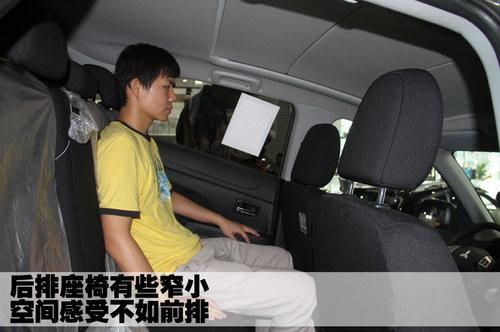 三菱ASX勁炫后排座椅靠背與坐墊的角度適中,不同身材體型的乘員在乘坐時能夠找到舒適的姿勢。但這款車的后排稍顯緊湊,頭部空間和腿部空間相對比較狹小。圖中的模特身高180厘米左右,頭部幾乎已經要頂到車頂。