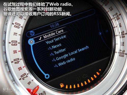 這套系統(tǒng)中整合了GPS導(dǎo)航、音響多媒體、車輛信息設(shè)置等諸多功能,最有特點(diǎn)的是其中MINIConnected這項(xiàng)功能,有了這套系統(tǒng),你可以將自己的蘋果iphone放入中央扶手,并與整套車載系統(tǒng)連接,可以延伸出更多的拓展功能,在試駕過程中我們體驗(yàn)了Web radio、谷歌地圖搜索等一系列創(chuàng)新功能,據(jù)說還可以接收用戶訂閱的RSS新聞。目前這套系統(tǒng)是否會裝備在進(jìn)入國內(nèi)的MINICountryman上我們還不得而知,但相信這種集成式的多媒體系統(tǒng)會是今后的發(fā)展趨勢。
