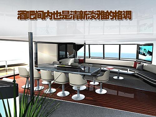 雙體船內部的的酒吧間的中間放置的為一個較大的長方形桌子,兩面相向各放置了5個吧臺椅,而較窄的一端則放置了一個吧臺椅。在這一設置的-側放置的則是舒適的長沙發,背后為明亮的窗戶,此外還配置了寬大的液晶顯示屏,另一側則是高高的吧臺設計。