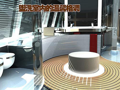 除了酒吧間外,其盥洗室也是同樣典雅的風格。優質的鋁金屬裝潢增添了貴族的氣息,環形的設計營造了溫馨的氛圍。輪船的尾端則是一個愜意的小型休閑空間,原型的小桌前放置這四個小巧舒適的沙發,在其后面則是兩個深色的沙發,從寬大的一體式窗戶投進了明媚燦爛的陽光。