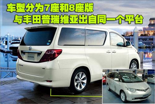 豐田Alphard該車有7座和8座版,這款車和國內銷售的普瑞維亞出自同一個平臺,但是從尺寸和配置上,據高于普瑞維亞。外觀上夸張的近期格柵和前大燈都顯得極為時尚,車側的對開拉手設計更是體現日系車的人性化,而尾燈和尾翼的配合也彰顯出獨特的運動風格。