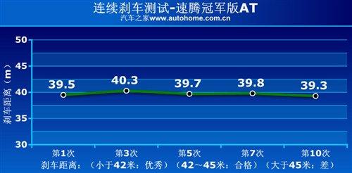 冠軍版與速騰其他車型相比剎車的優(yōu)勢比較明顯,車重大于速騰1.4TSI,但實際的制動距離短了1米,寬胎起了直觀重要的作用,在剎車時輪胎與地面接觸面積大,保證了足夠的摩擦力;10次連續(xù)制動測試,冠軍版剎車系統(tǒng)表現(xiàn)出的穩(wěn)定性也讓我們放心,距離偏差很小。