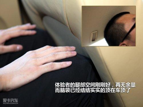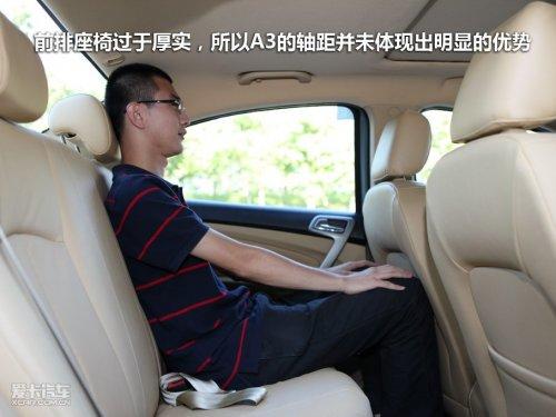 A3的軸距不小,但是與實(shí)際的表現(xiàn)有些出入,身高1.82米的體驗(yàn)者調(diào)整好前排座椅后,坐在后排腿部空間剛好夠用,前排座椅的造型完全可以經(jīng)過設(shè)計(jì)后騰出更大的地方。更不幸的是我們的體驗(yàn)者腦袋已經(jīng)頂住車頂了,可以說是漂亮的C柱下滑的流線犧牲了第二排的高度。