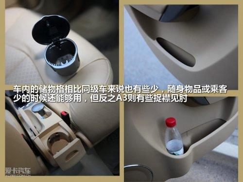 車內(nèi)的儲(chǔ)物格相比同級車來說有些少,移動(dòng)煙灰缸占用了一個(gè)杯架,手機(jī)、煙盒等等則占用了另一個(gè),而杯架真正的主人只能放在車門上了。其方向盤左側(cè)提供了一個(gè)儲(chǔ)物格,只是這個(gè)儲(chǔ)物格開開關(guān)關(guān)的實(shí)在不方便,所以只能放洗車卡之類的不太常用的東西。也許這么看A3的儲(chǔ)物格夠了,可是如果隨身的東西再多一些,A3的儲(chǔ)物空間就捉襟見肘了。