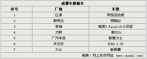 這屆成都車展上,既有國產車型又有進口車型首發,其中江淮和斯柯達將發布運動版車型,而奇瑞、力帆和廣汽豐田分別發布瑞虎3小改款、新520、新雅力士三款改款車,而備受關注的沃爾沃XC60 2.0T也將在車展上市,預計售價在40-50萬之間。另外大眾新輝騰將在車展期間推出,新車除了搭載3.6L、4.2L和6.0L三款引擎之外,還將有3.0T渦輪增壓引擎推出。