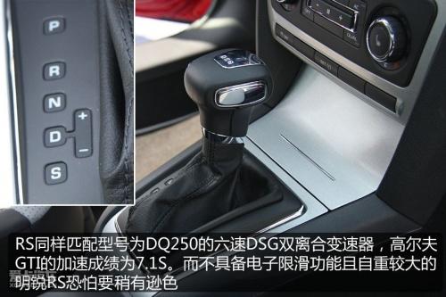 明銳RS搭載了與高爾夫GTI相同的發動機和變速箱,動力上采用EA888系列的2.0TSI渦輪直噴發動機,最大功率147kw,峰值扭矩280Nm,同樣匹配型號為DQ250的六速DSG雙離合變速器,這一動力組合用在高爾夫GTI上的加速成績為7.1秒。