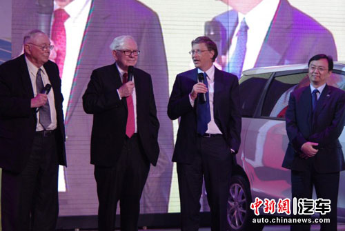 隨著一輛銀色的比亞迪M6緩緩駛上舞臺,巴菲特、王傳福以及比爾·蓋茨、查理·芒格在閃爍的鎂光燈和全場關注的目光中依次走出M6,笑容可掬的巴菲特甚至朝著M6豎起大拇指。
