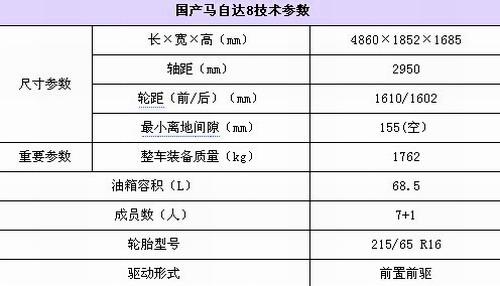 資料顯示,國產(chǎn)馬自達(dá)8的車身尺寸為長4860mm;寬1852mm;高1685mm,最多可以容納8人,遠(yuǎn)遠(yuǎn)超過B級(jí)轎車的2950mm軸距保證了足夠的后排空間。