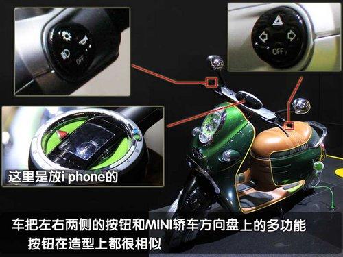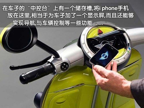 MINI Scooter E概念車將i phone手機與電動車融合,通過位于車輛頂端的專用接口。車主的i phone手機可以放置于其中,與車輛的音響和信息與了系統實現最大化的兼容。此外,還有一項有趣的功能,可以通過谷歌地圖來顯示其它騎車者的位置,甚至可以發出結伴而行的邀請。
