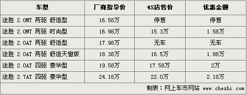 北京現代途勝是SUV市場銷售時間比較長的一款車型,在經過09款車型升級后,配置上有一定的提升,整體的性價比相對老款有提升。目前途勝全系車型優惠的幅度均在萬元以上,具體車型以及價格如下: