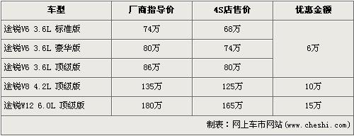 途銳是大眾首款引進(jìn)我國(guó)的SUV車型,在3.6L及4.2L率先上市后,大眾為了滿足消費(fèi)者的更大胃口,緊接著又推出了搭載12缸發(fā)動(dòng)機(jī)的6.0L車型。隨著大排量消費(fèi)稅的頒布,給9月份后入關(guān)的大排量車型帶來了一次不小的沖擊,令大排量汽車價(jià)格都上調(diào)了不少,大眾途銳6.0L頂級(jí)版也從原來158萬(wàn)元的價(jià)格上調(diào)至了180元。近日據(jù)網(wǎng)上車市價(jià)格數(shù)據(jù)監(jiān)測(cè)顯示,大眾途銳全系的最高優(yōu)惠達(dá)到了15萬(wàn)元,具體詳情請(qǐng)看下表: