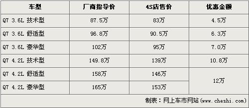 據銷售人員介紹,奧迪Q7分為3.6L和4.2L兩種排量共7款車型,目前全系最高優惠為12萬元。3.6L車型最高優惠7萬元,其中最低配的技術型優惠后售價降到了83萬元,3.6L舒適型售價降到了90.5萬元,3.6L豪華型售價95萬。排量更大的4.2L車型優惠最高更是達到了12萬元,4.2L舒適型售價降到146萬元,4.2L豪華型售價降到了153萬。