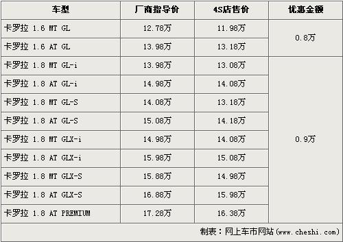卡羅拉是一汽豐田于旗下的主力經(jīng)濟(jì)型轎車,上市后憑借著時(shí)尚的外觀贏得了消費(fèi)者的喜愛。卡羅拉全系共有5款車型,排量分為1.6L、1.8L,價(jià)格區(qū)間為13.28萬元-17.98萬元。前段時(shí)間,豐田官方對卡羅拉全系下調(diào)了廠商指導(dǎo)價(jià),最高下降了9000元。近日根據(jù)網(wǎng)上車市價(jià)格監(jiān)測系統(tǒng)顯示,近期在經(jīng)銷店購買卡羅拉車型的消費(fèi)者,可以得到最高9000元的優(yōu)惠,具體詳情請看下表: