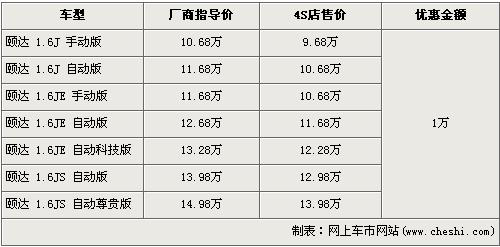 據東風日產4s店銷售人員介紹,目前頤達全系車型現金優惠1萬元。經優惠后,入門級的1.6J 手動版車型售價從10.68萬元下降到了9.68萬元,高配的1.6JS 自動尊貴型售價也下降到了13.98萬元。銷售人員還介紹,目前店內沒有頤達現車,欲購買者需交1000元訂金約等一個月時間。